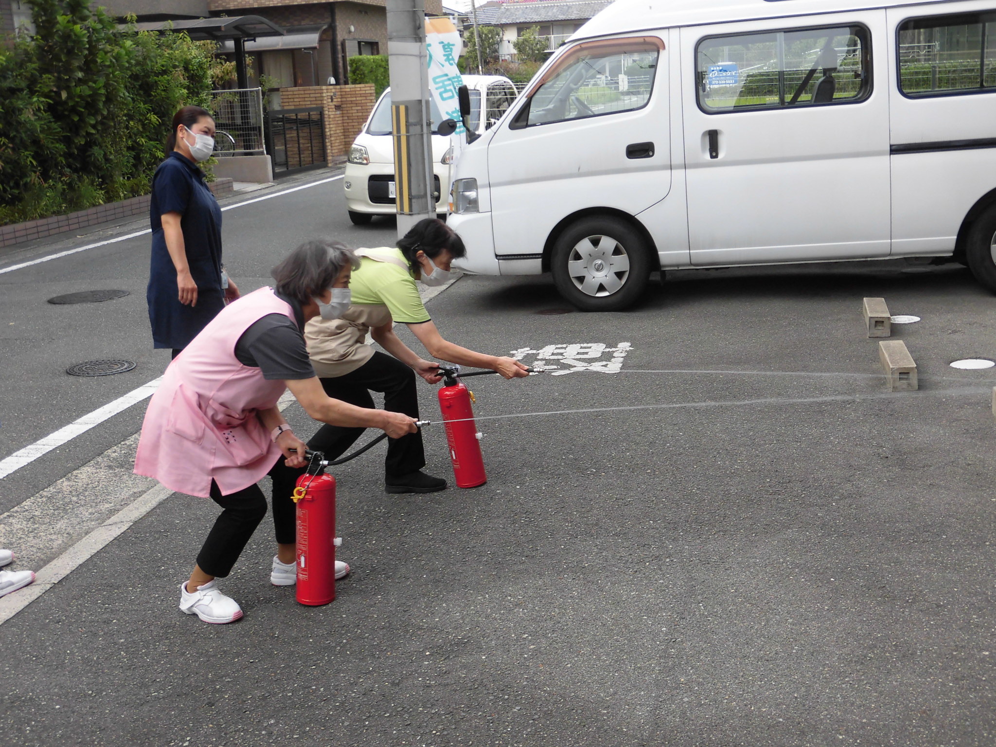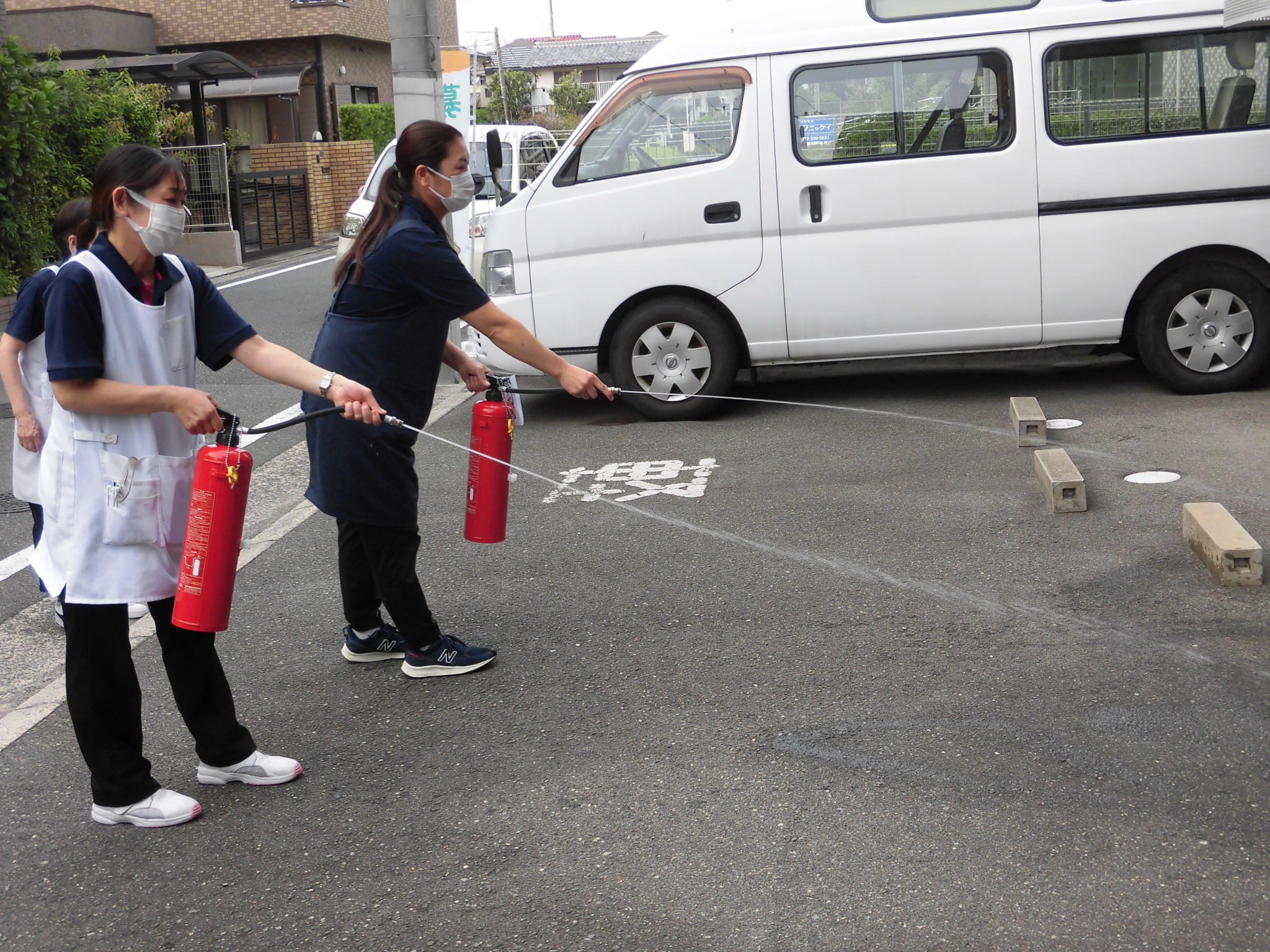 訓練用消化器の中身は水なので本物(泡)とは異なりますが、実際に触って操作してみることが大切ですね。