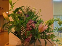 シンピジューム🌺、枝スイトピー🌺、ストイック🌺、コデマリ🌺、百合🌺、アレカヤシ🌺になります🌺