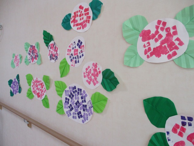 事務所前に飾っているアジサイの掲示物ですが、入居者様がお手伝いしてくださいました(≧▽≦)