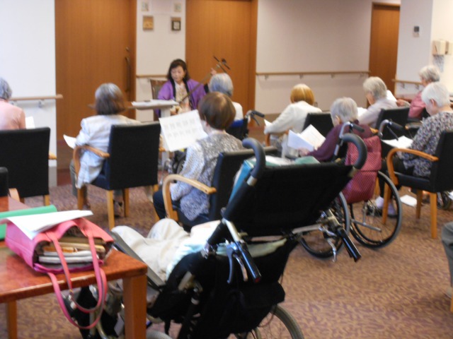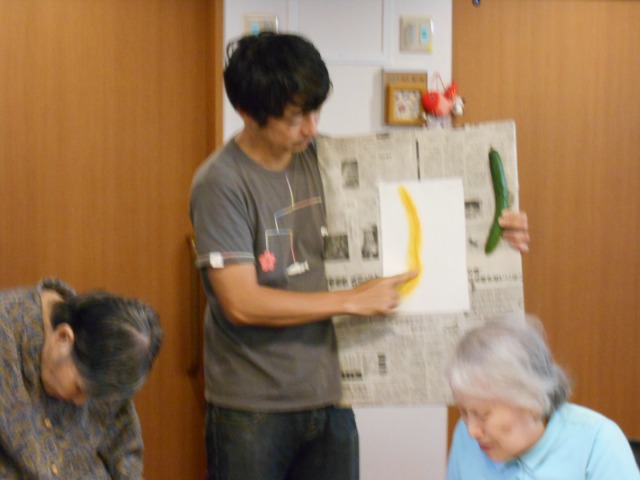 スタッフが「手伝ってくださーい。」とご入居者様へ声をかけています。