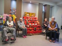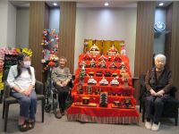 玄関ホールに7段飾りのひな人形を飾らせて頂いております。本日は、ひな祭りなので、女子のご入居者様と一緒に写真撮影を行いました。