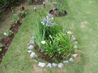 黄色いカラーの花と、アカパンサスが綺麗に咲きました。