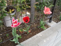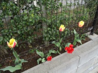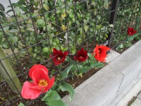 施設脇のフェンスにチューリップが色とりどりに咲きました。