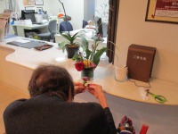 修繕?に見えたご本人様からの意外な頼み事「外に出て黄色の花仕入れて来て・・・」「えっ!盗んで(施設の物ですが・・・)来るんですか?」「そう、そう)^o^(」お花3~4本お渡ししながら「黄色い花はなかったです。これ以上盗むと怒られますから、これぐらいにしておきましょう」「しょうがない」と、黙々とお直し、センスが良いせいか、又、素敵な物が出来上がりました。ありがとうございます。
