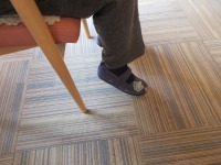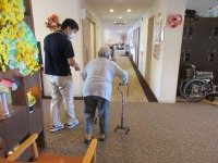 指導で杖歩行でリハビリ室から共用部を