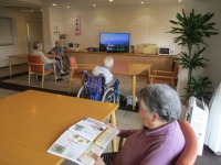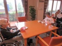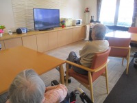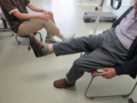 リハビリ室にて起立訓練の後、歩行能力に合わせ