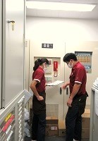 一階洗濯室からの出火を想定し、まずは火災報知器を作動させます。
