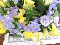 薄紫色のスプレーストックや、黄色のスイートピーがメインの