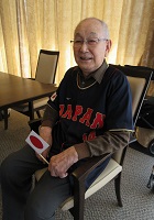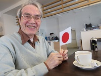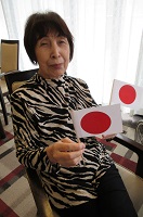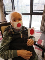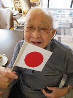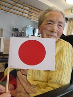 お手製の日本の国旗を持って