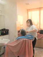 一階ラウンジの窓際でI様が髪を切ってもらっていると、ついウトウト・・・。