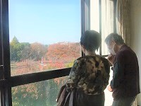 五階ラウンジから見下ろす、公園に広がる紅葉は