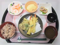 お赤飯や天麩羅、鶏肉の八幡巻、紅白なます、フルーツでした。