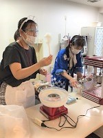 わたあめ機にざらめを投入し、割り箸にくるくると