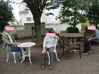 作業終了後はお庭の木陰でご夫婦そろってひと休み。