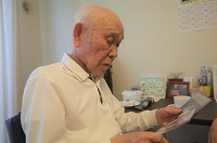 この写真は、奥様と昔行かれたハワイ旅行のお写真を見ているところです。