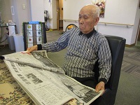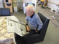 1階のラウンジで新聞を読んでいらっしゃる入居者様