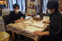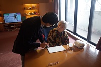 最初の写真は、耳が遠い入居者様と筆談でのやり取りをしている風景です。