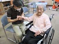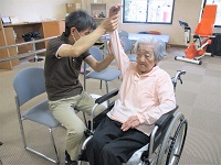 写真1~3は右肩の可動域を広げるため、徳田さんと一緒に腕を動かすリハビリをしている様子です。