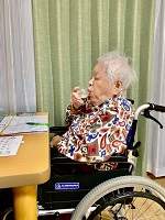 午前中の入浴後、息子様から頂いたアイスクリームを召し上がっていた入居者様✨