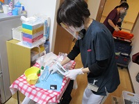 入れ歯の具合が悪くなったり、虫歯で歯の痛みや歯茎が腫れてしまう入居者様がいらっしゃいますが、毎週月曜日に歯科往診があり歯科医師と歯科衛生士さんが往診に来てくれて、歯の治療をしてくれます。