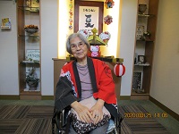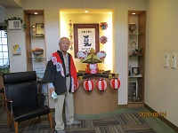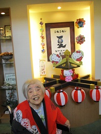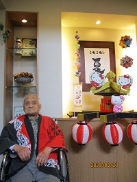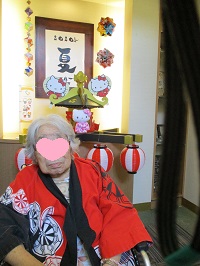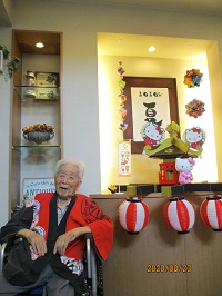 入居者様に祭り半纏を着て頂き、キティちゃんお神輿の前で