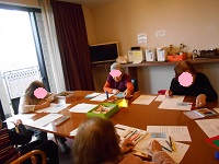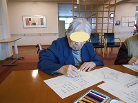 切り絵は、色紙を小さくちぎり、糊で貼る作業が