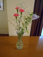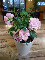 プレゼントの「ミニ薔薇の鉢植え」を、お部屋に飾り、
