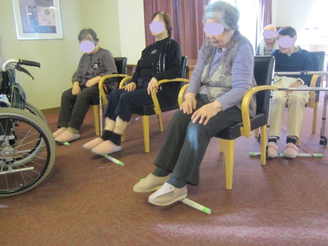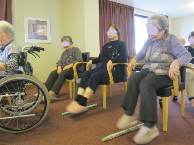 足の体操は、棒を床に置き、右左に動かしたり、
