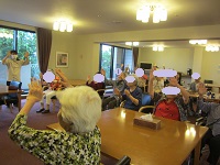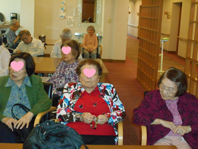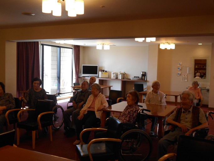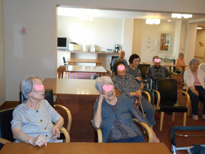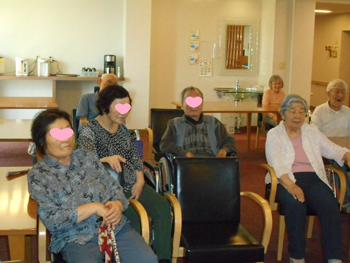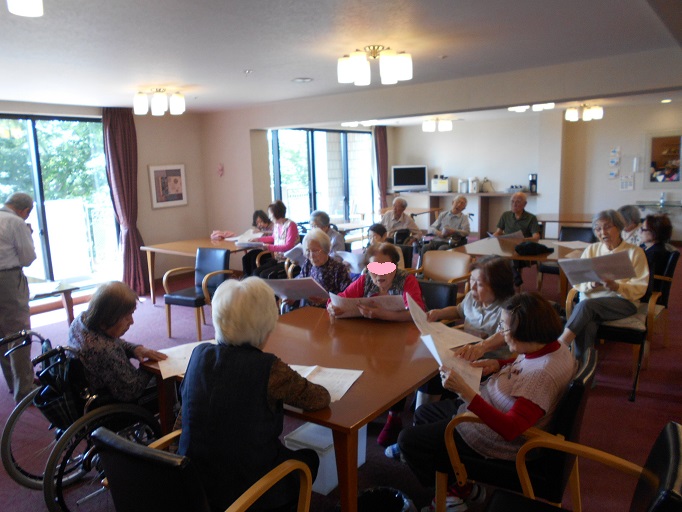 入居者様も楽しんでいただけるよう、昭和歌謡曲の歌詞カードをご用意して下さったので、ハーモニカに合わせて、皆さんにも歌っていただきました。