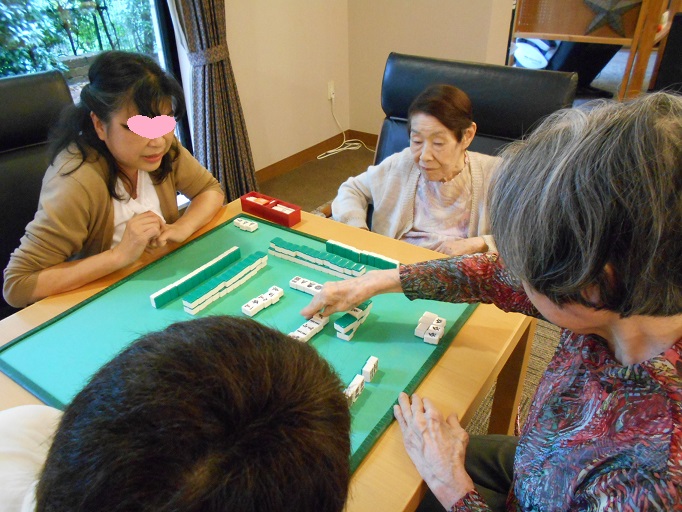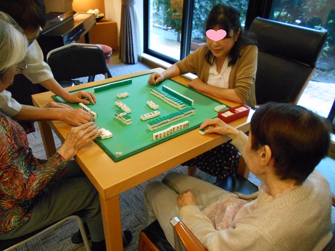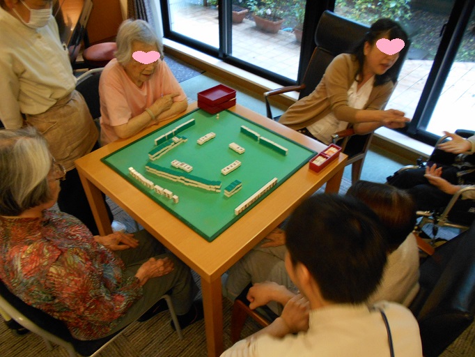 牌を並べたところで、参加されていたご入居者様のご家族様が面会に来られ、ちょうど一人足りなかったので、急遽参戦していただきました。