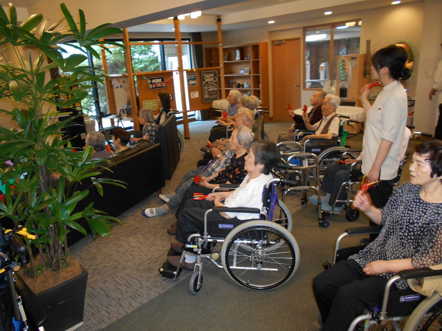 午後のレクリエーションは音楽に合わせて、歌と体操の