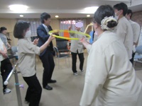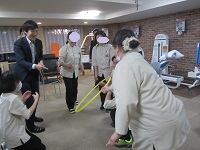 皆で協力して人差し指1本でフラフープを持ち上げる。