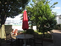 玄関先のテーブルに新しい赤いパラソルがお目見