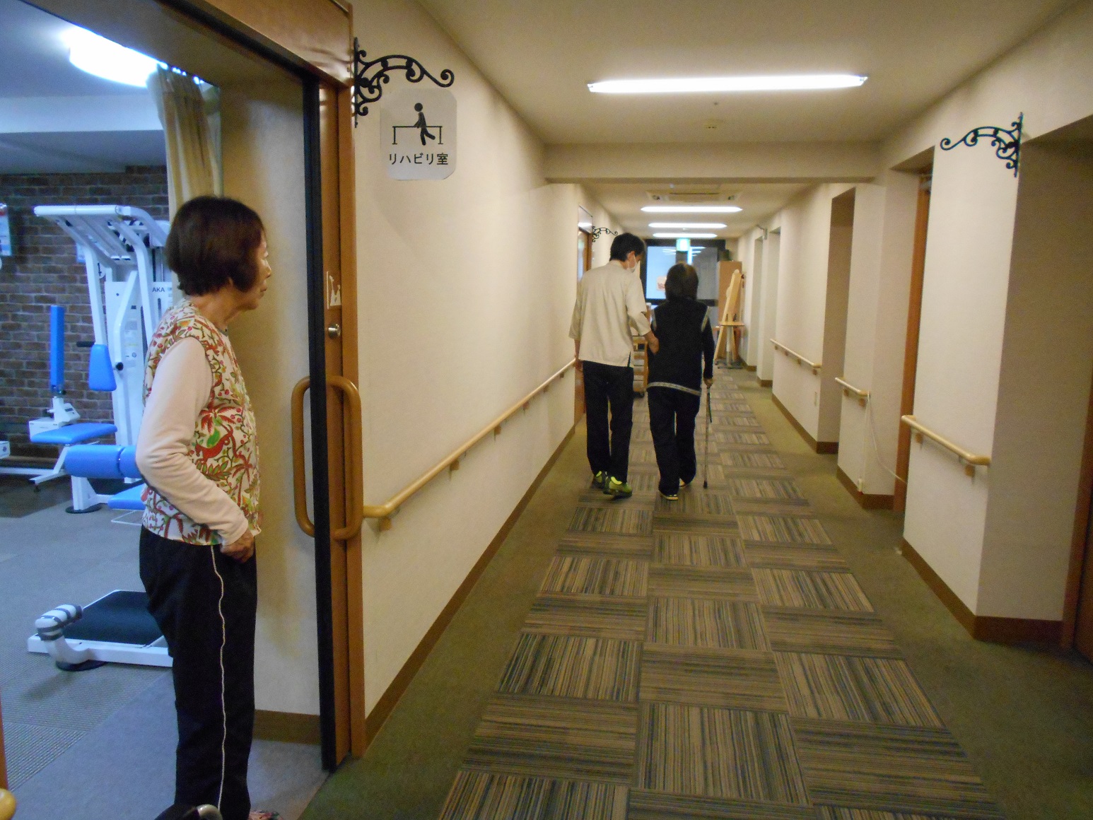 リハビリ室での運動後、廊下の歩行練習も、そっと見守ってくださっているご入居者様。