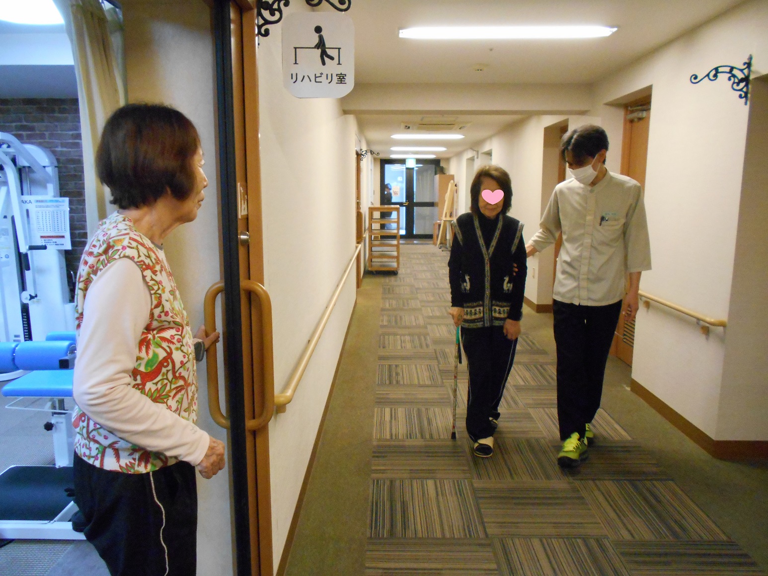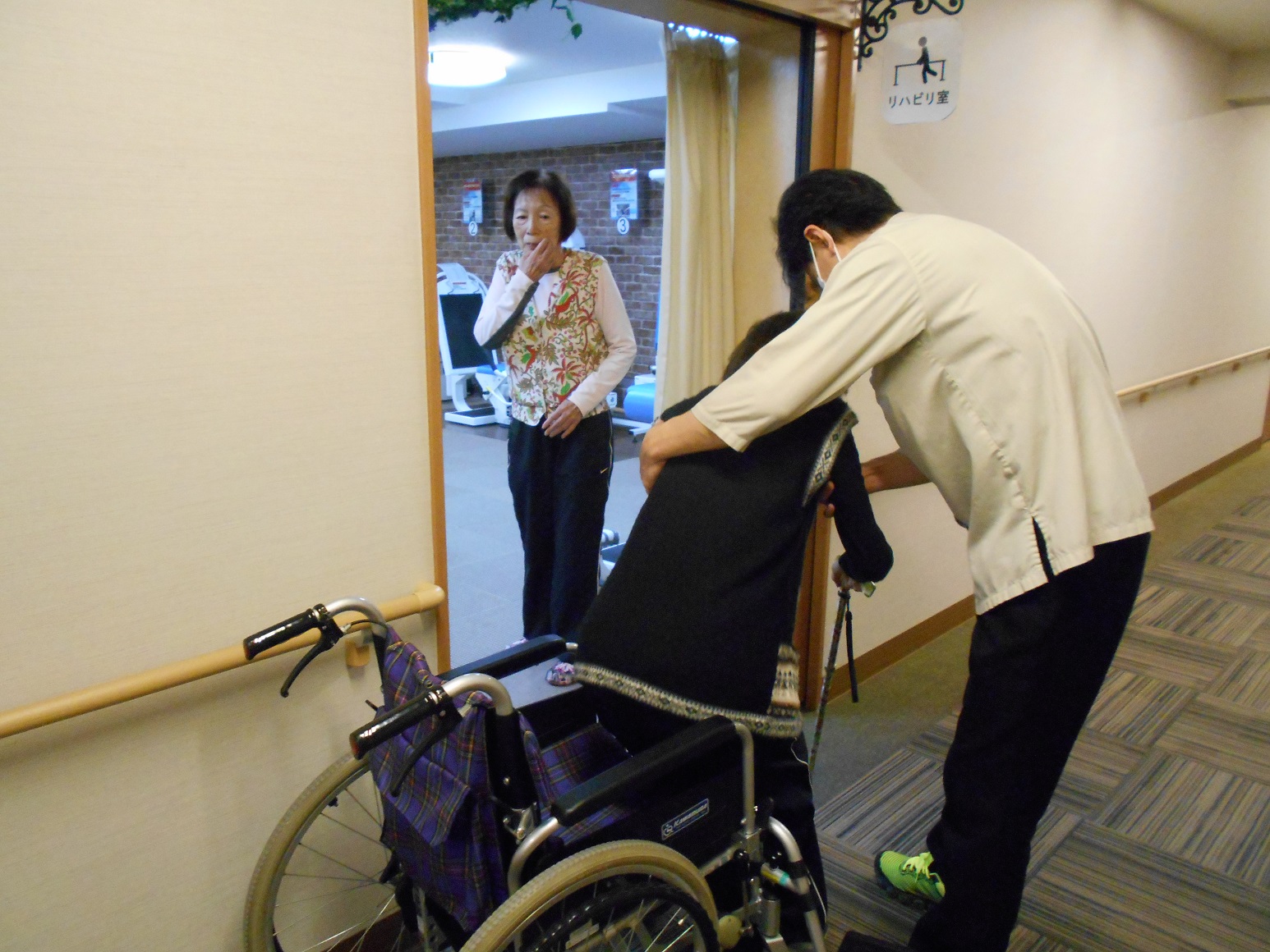 カメラを向けたら、リハビリ風景を撮ると思われたようで、席を外してしまわれましたが、仲良しの入居者様のリハビリに付き合ってくださっていたようなんです。