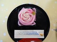 ツバキの花の練りきりの和菓子が目にも鮮やかで