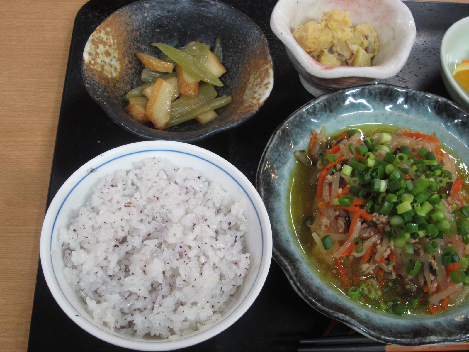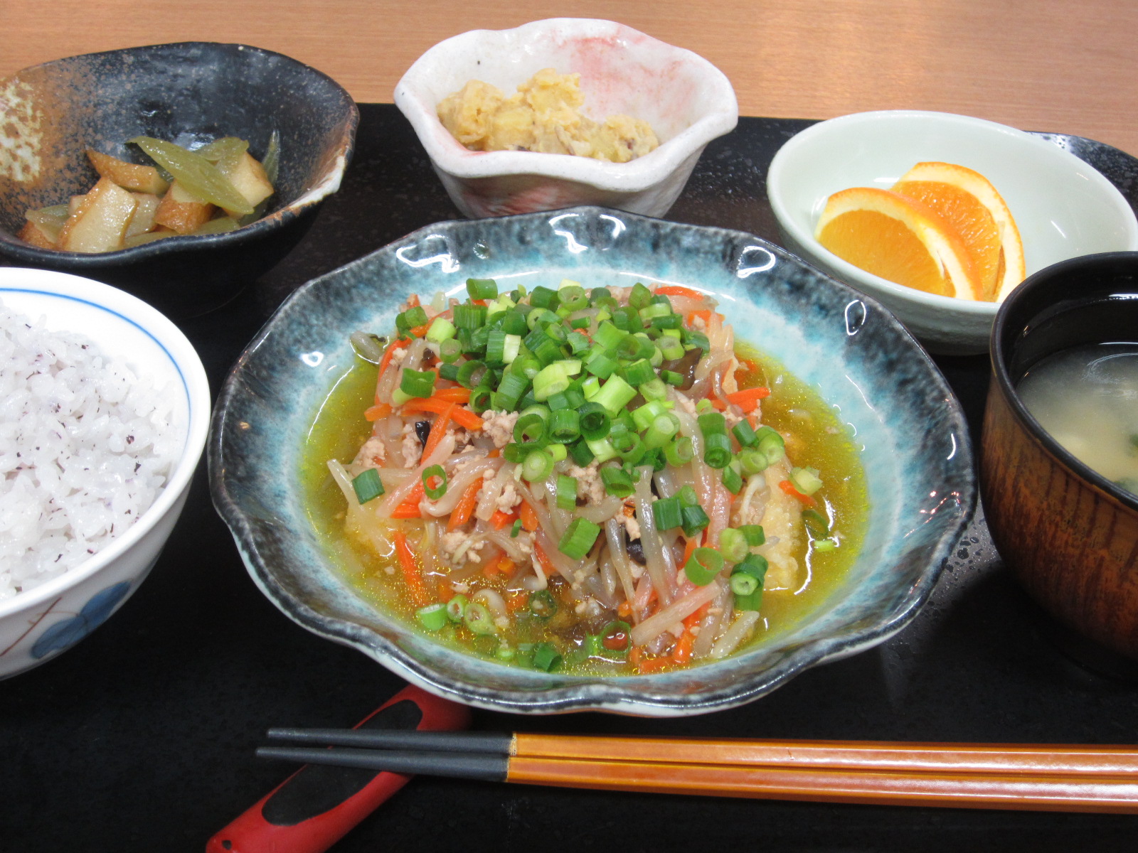 献立としては、揚げ豆腐の肉野菜あんかけ、ふきの炒め物、