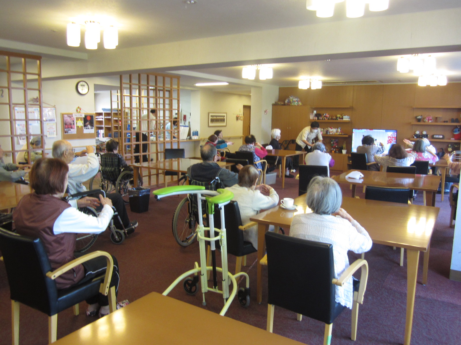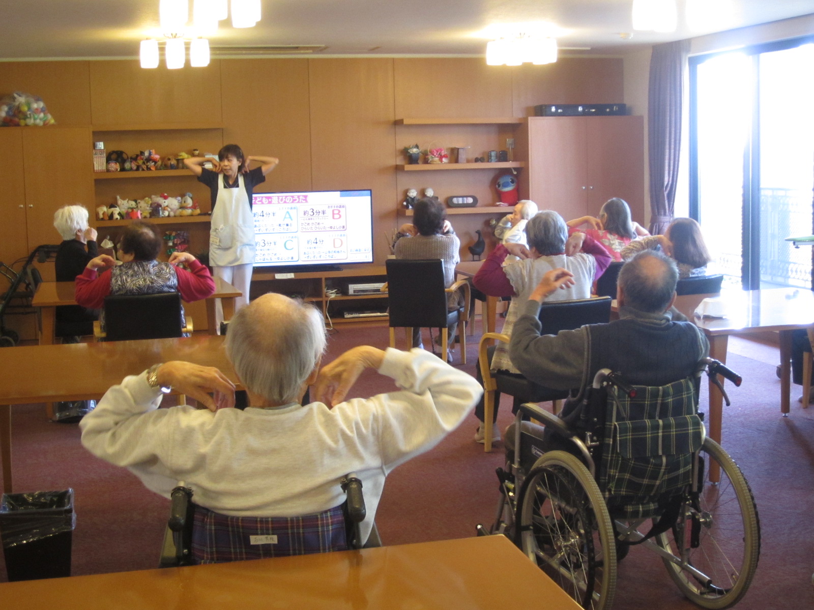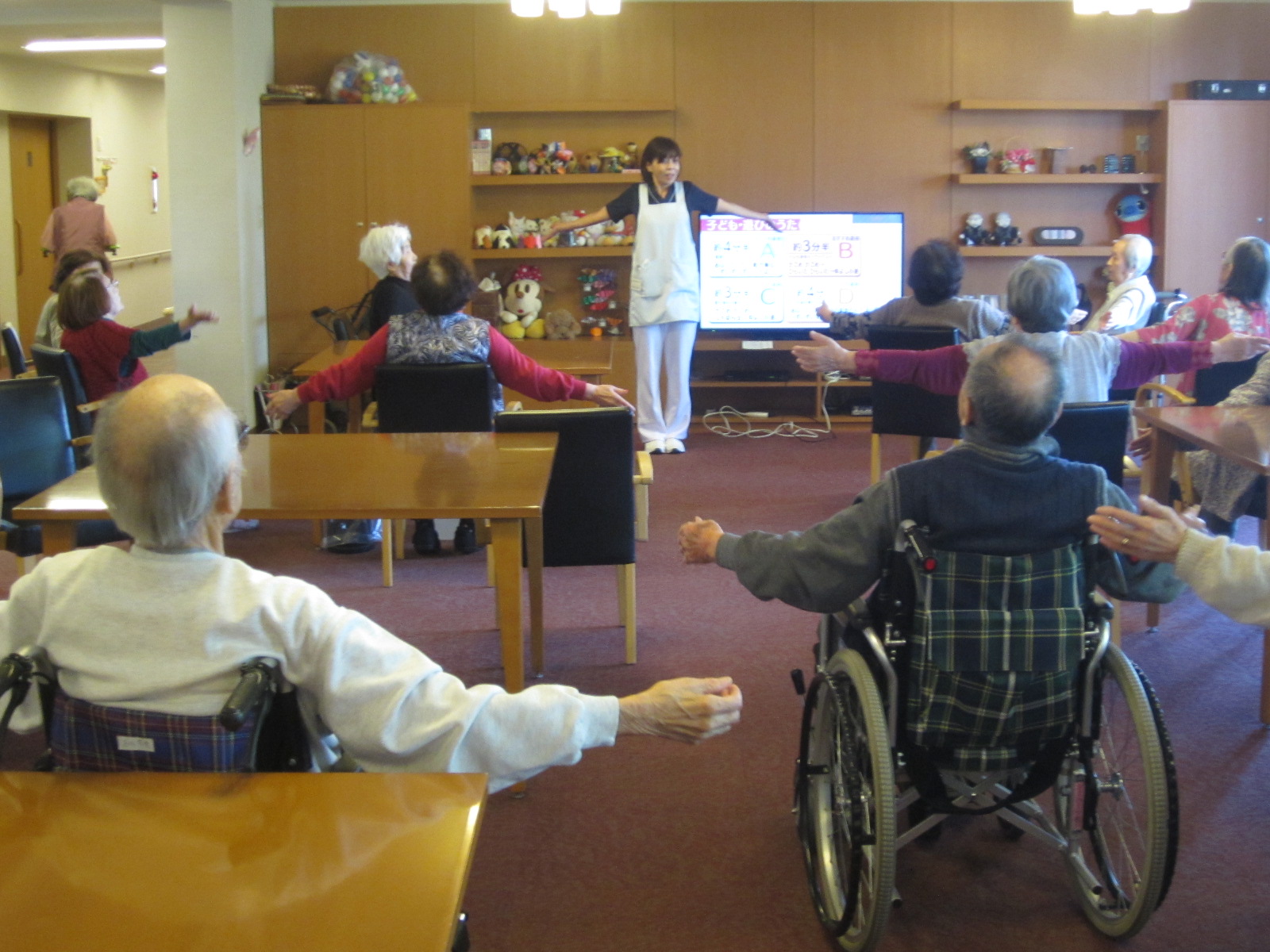 まだ体操の動きがぎこちなく、ご入居者様のほうが慣れてらっしゃる感じですが、大きな声が出てるので、皆様と馴染めるのもきっと早いことでしょう♪
