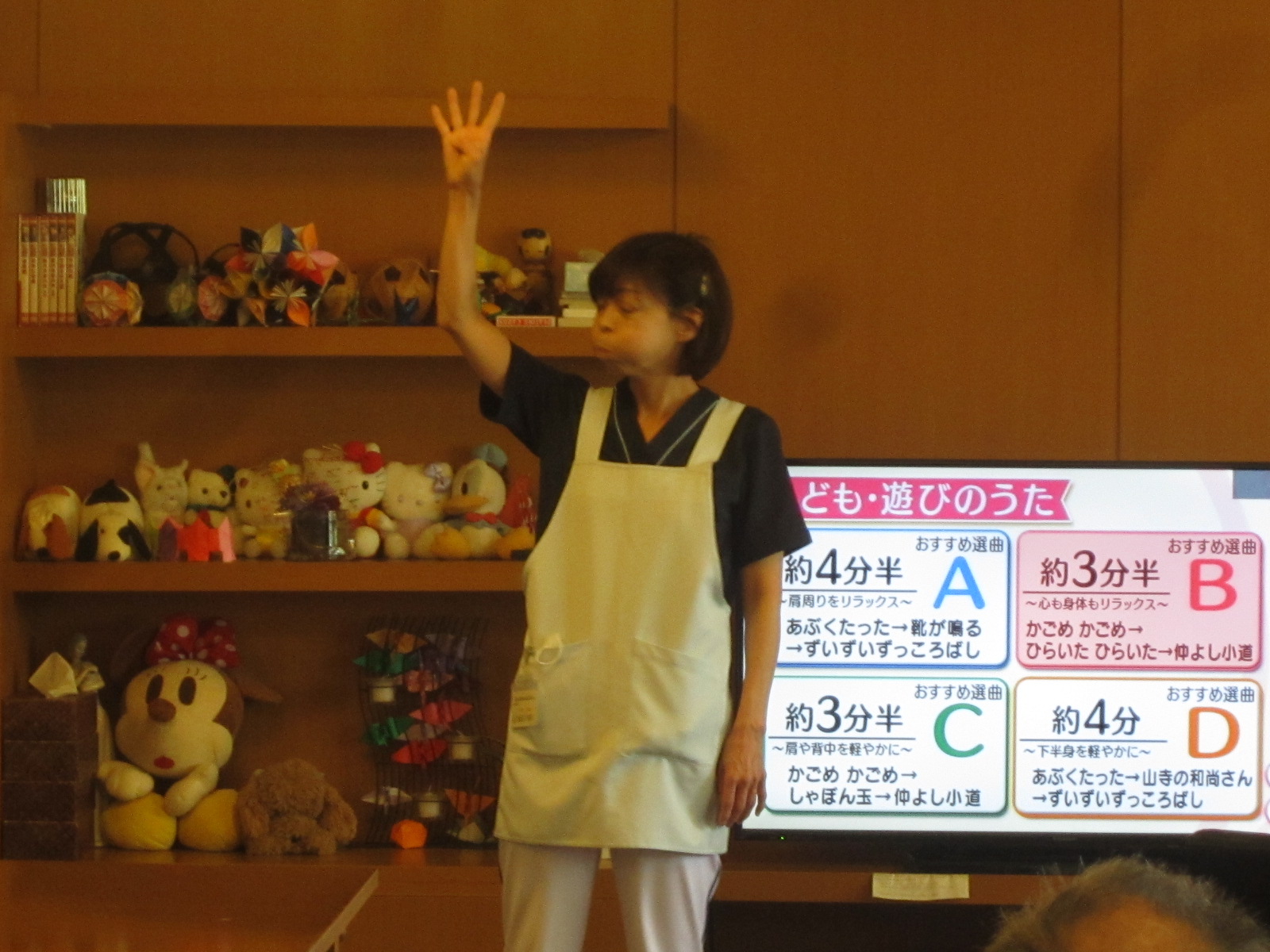 今日は歯科往診の日なので、お昼の体操の後は、歯科衛生士さんのよる口腔体操です。