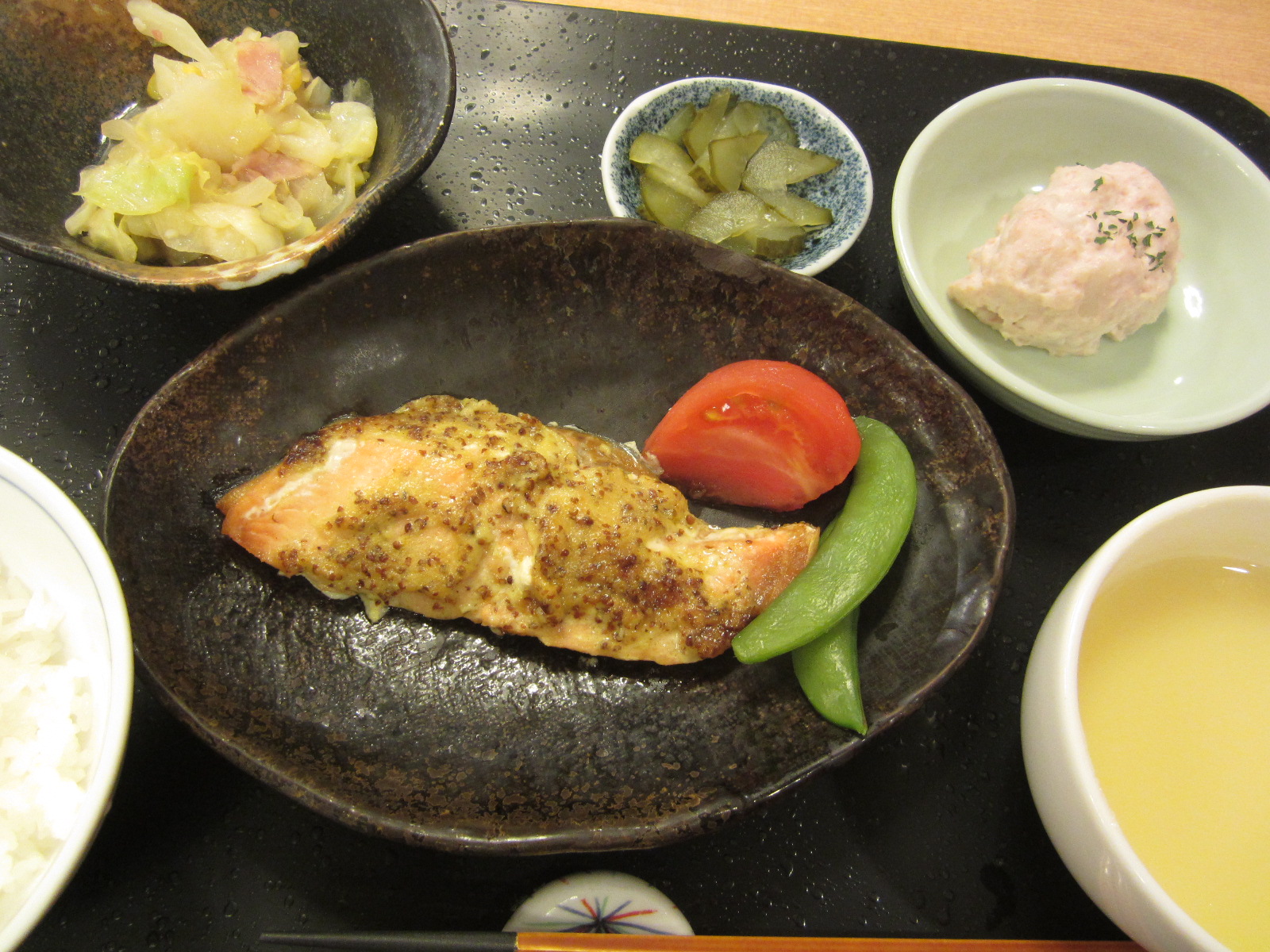 メインは、マスの粒マスタード焼き、そして春キャベツのソテー、タラモサラダ、ポタージュ、ピクルスです。