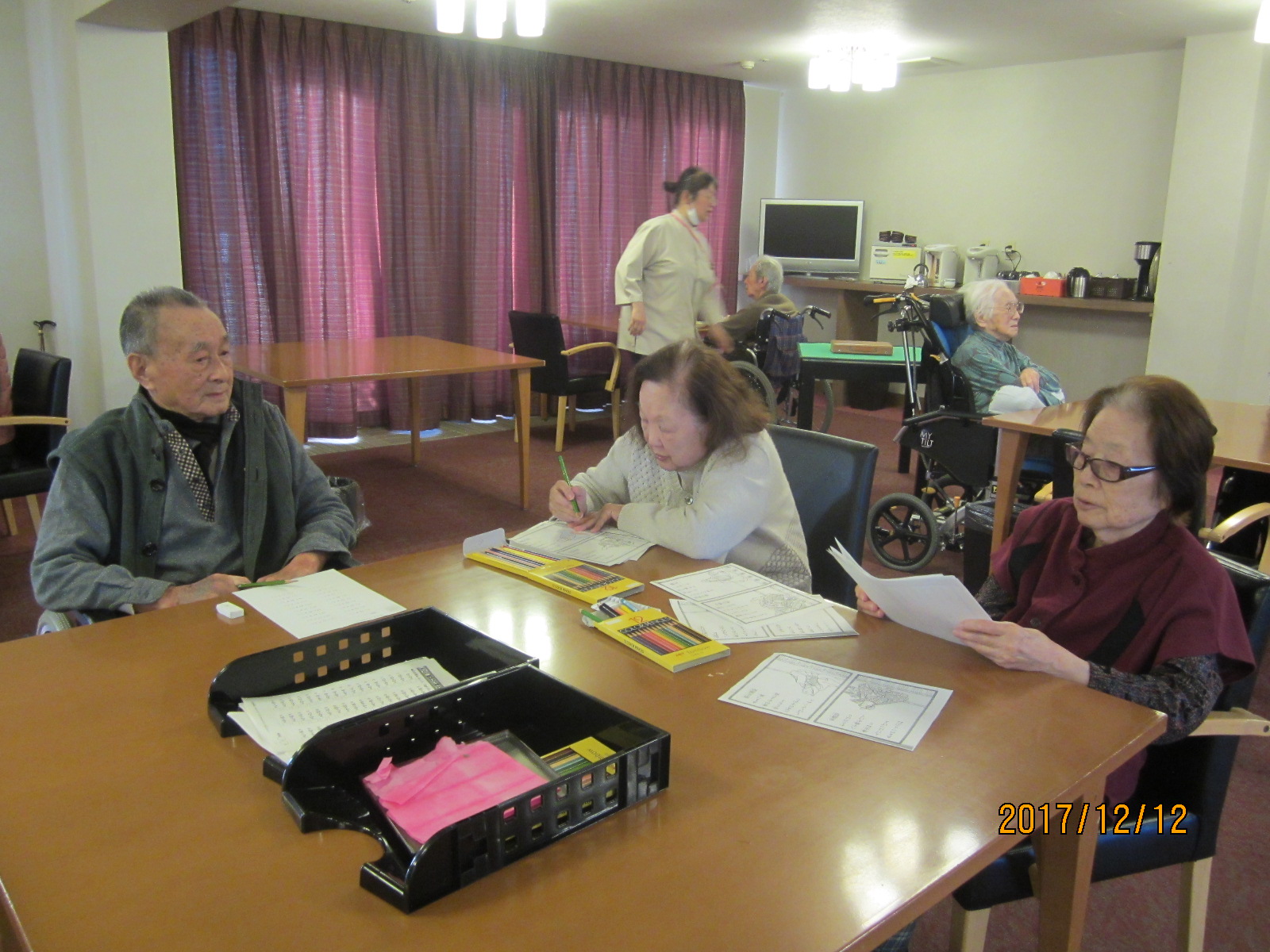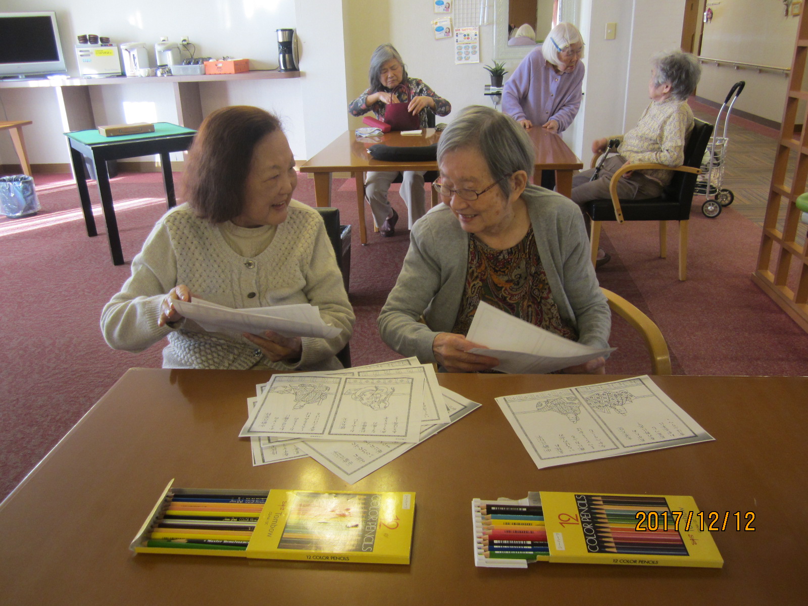 それぞれ渡された塗り絵の百人一首を詠んで、『私のほうはコレよ~(^O^)』『どれどれ?私のほうはね・・・』何て言いながら、キャッキャッと一通り楽しんだ後は、塗り絵に集中 (@_@。