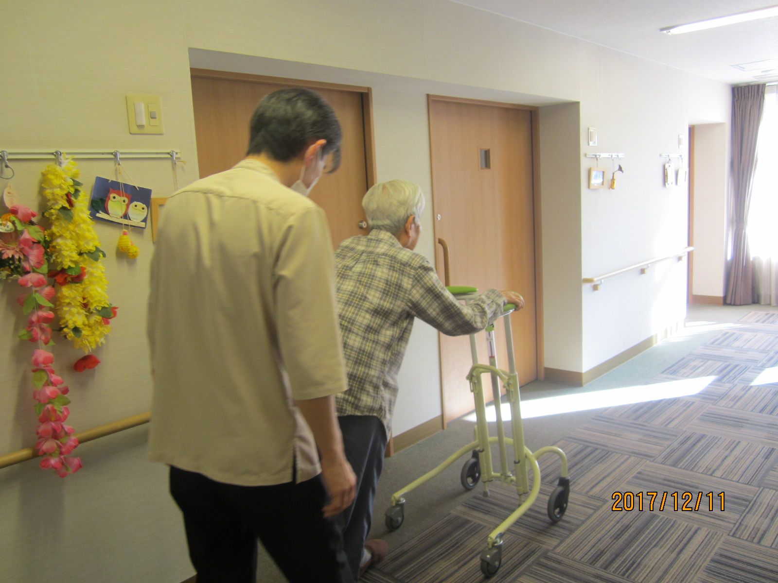 思い返せば、ご入居された当時はご自分で歩行されていたことを思うと、全介助の車椅子生活になり、そこからリハビリを続け、車椅子の自走、ご自分での移乗と着実にステップアップされて、とうとう歩行器による歩行練習。