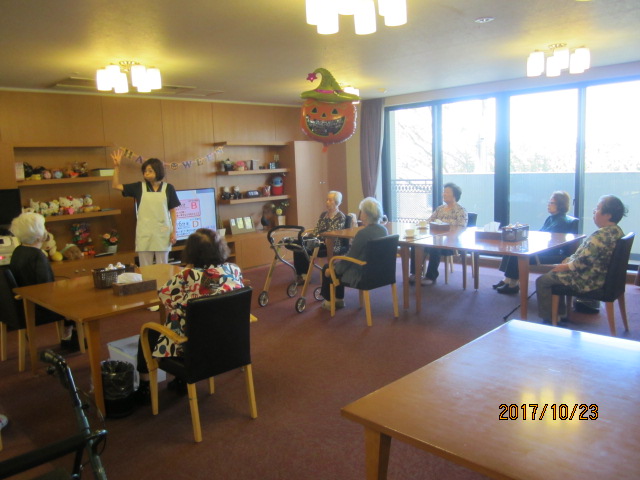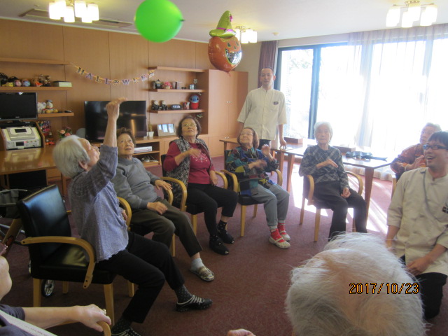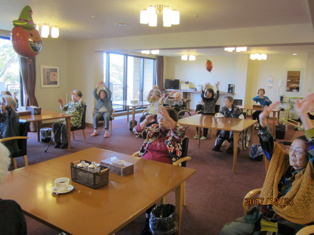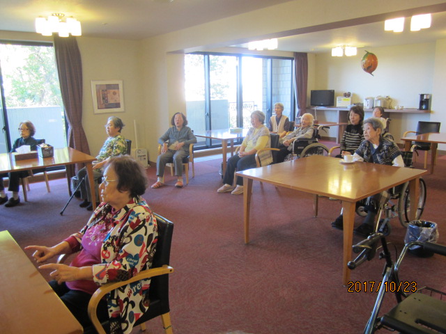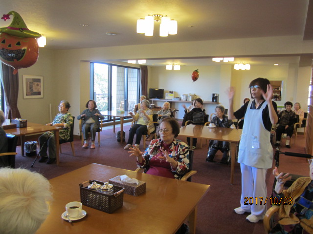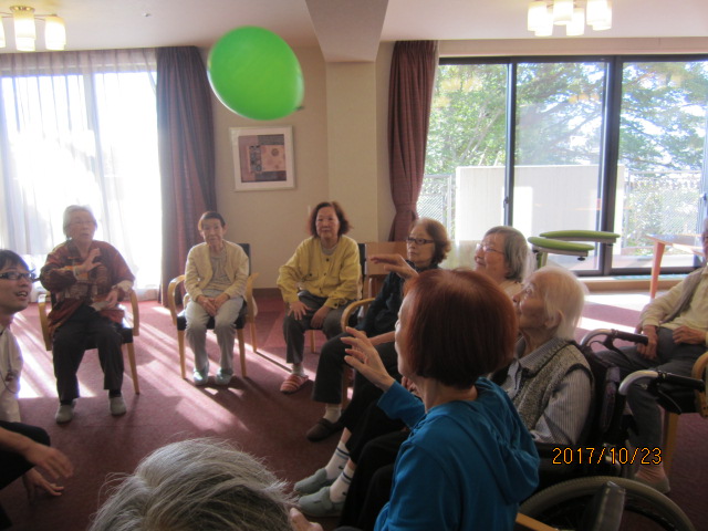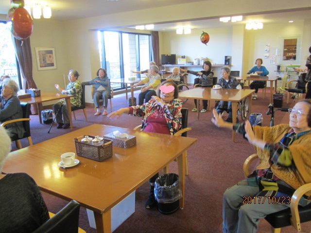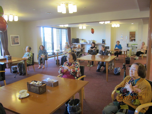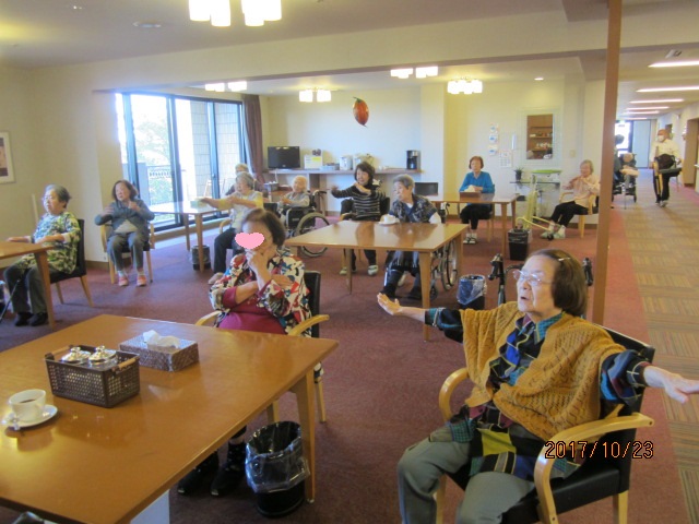 「動作が間違えているよ。」と他の入居者様に教えてあげている入居者様の動作が皆さんと違っていて、それをお知らせしたら、ご自身の体操が疎かになっていることに気が付き、爆笑して苦笑い(^^;)
