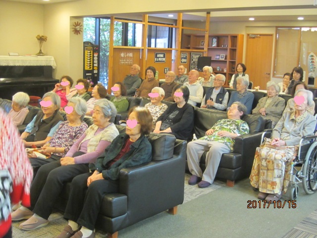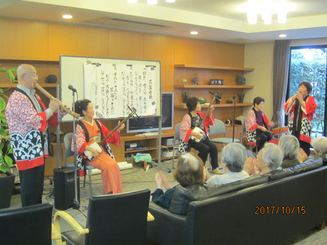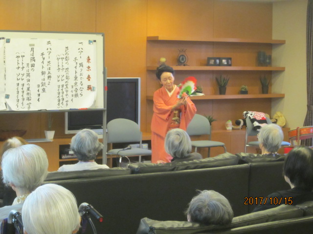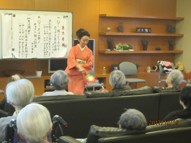 ご入居者の年代は、民謡に慣れ親しんでいるのか、参加率も多く、一緒に歌ったり、手拍子で応援してくださりと、唄あり、踊りありの1時間で、たっぷり楽しませていただきました。