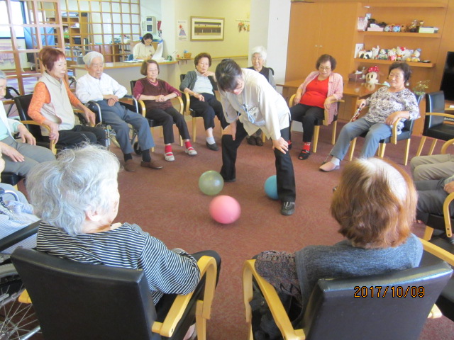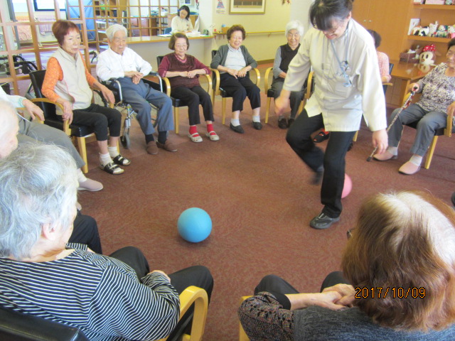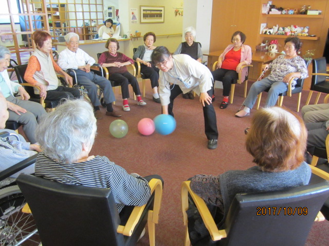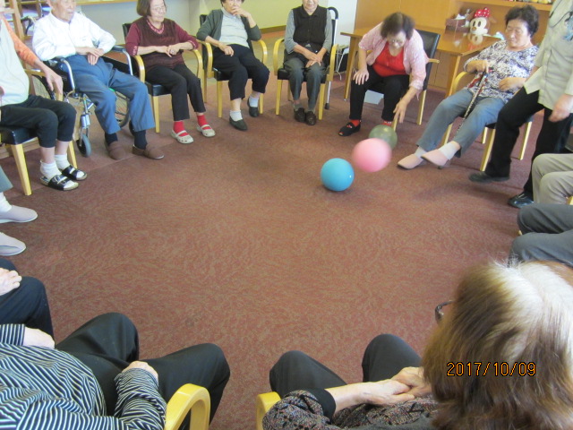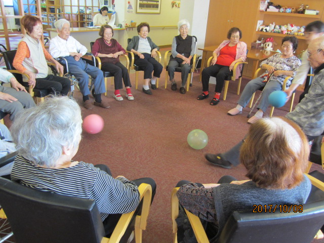 スタッフは、ボールを蹴るご入居者様の正面に立ち、ゴールになろうと身体を入れ替えて頑張っていましたが、ボールが3個も入っていたので、八方からボールが転がってきて、右往左往状態(^^;