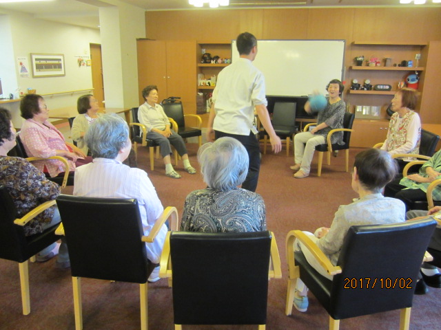 皆さんで輪っかになってのボールゲーム、これもまたご入居者様のウケが良い、鉄板レクです。