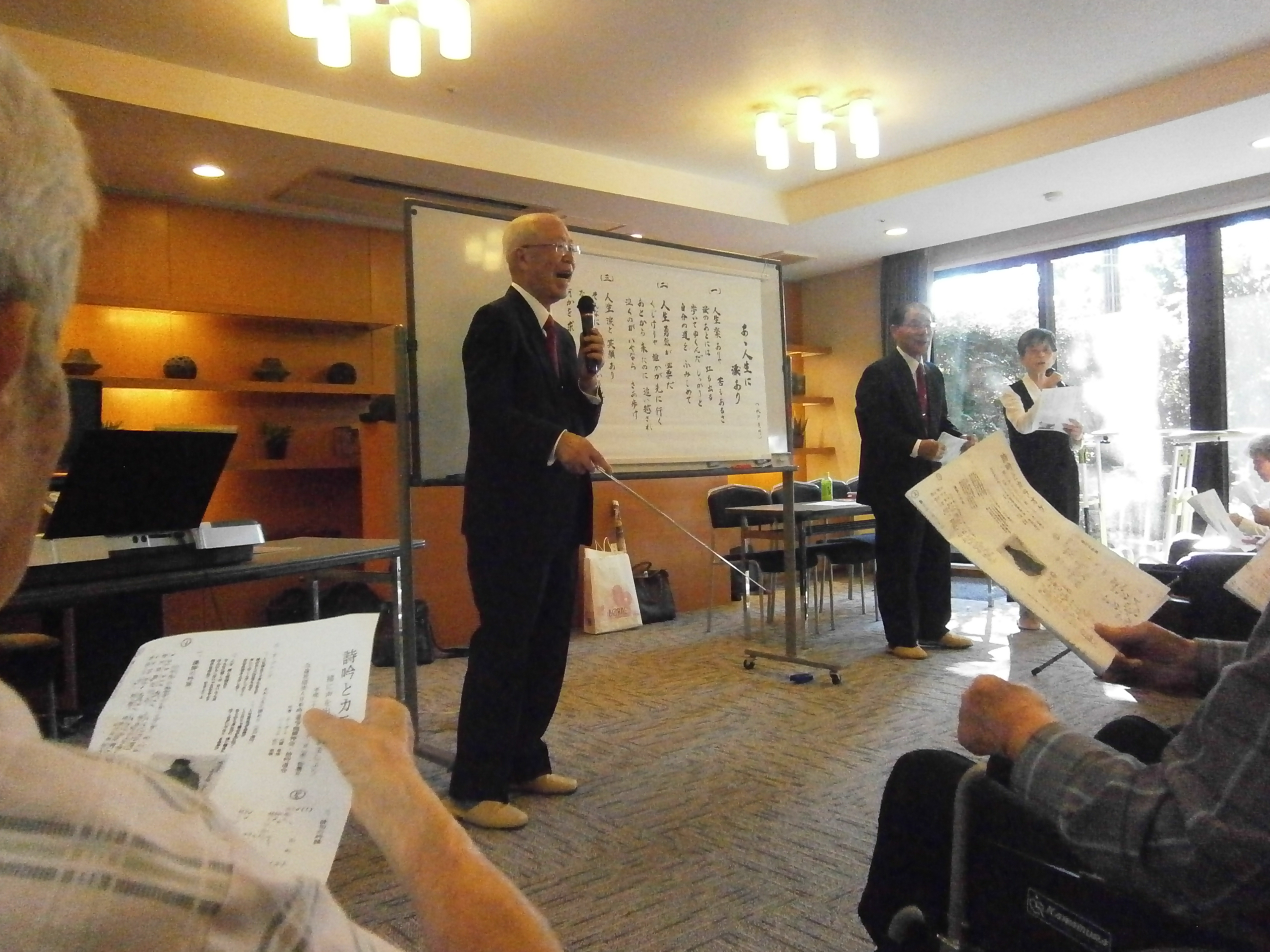 まずは、声出しの練習として、ご入居者様の皆様も一緒に「ああ人生に涙あり(水戸黄門のテーマ曲)」を歌い、その後は漢詩や和歌に始まり、俳句や歌謡入りの吟詠など全15曲をたっぷり披露♪