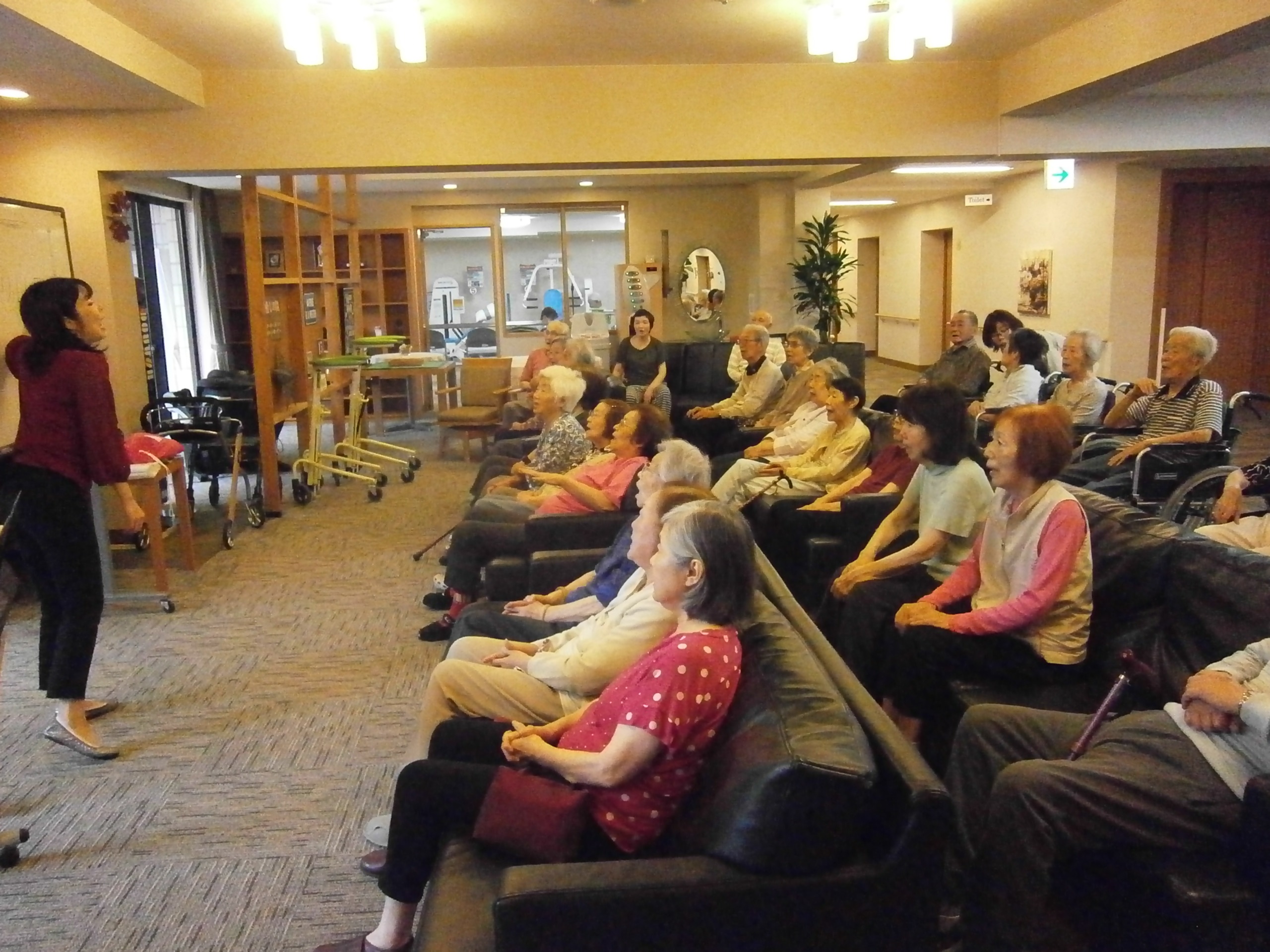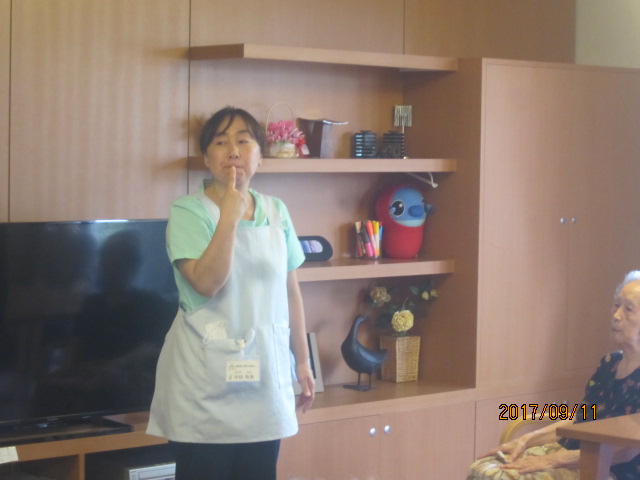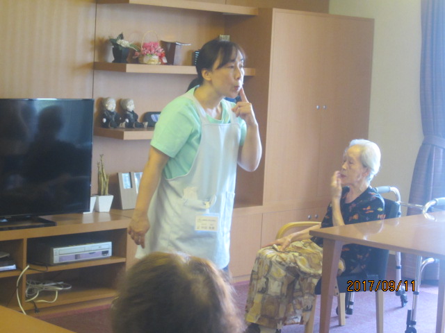 毎週月曜日に往診をしてくださる歯医者さんがいらっしゃるのですが、いつも行っているお昼の体操に合わせて、歯科衛生士さんが口腔体操を実施してくださっております。