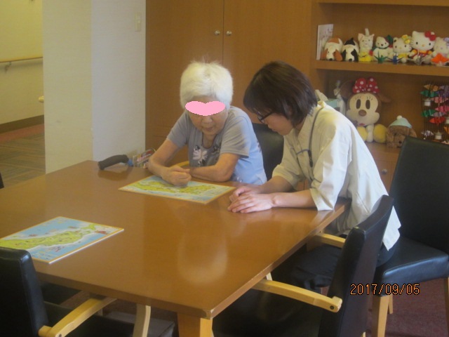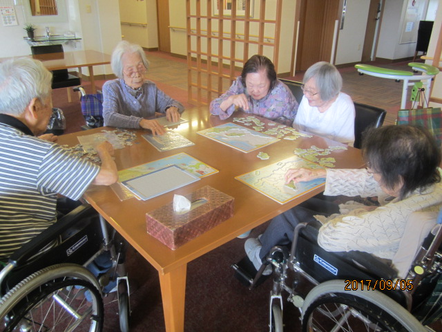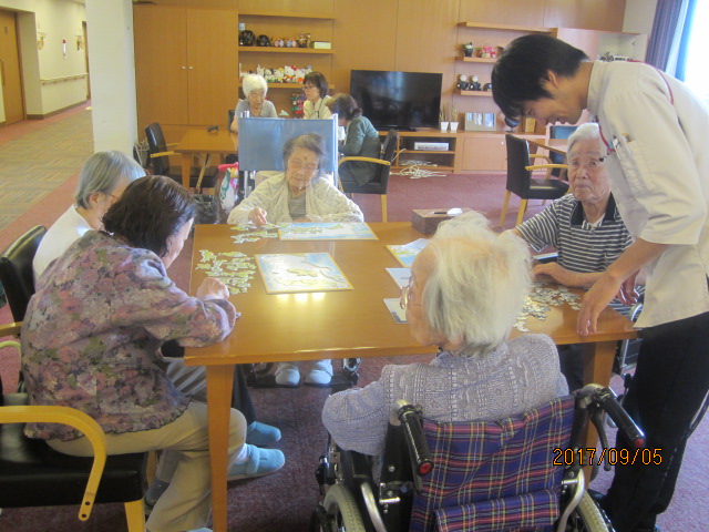 皆さんで一度に楽しめるよう、同じ絵柄のパズルもあるのですが、その同じ柄をい2ついっぺんにバラシてピースを混ぜてしまい、難易度を上げてしまったご入居者様が苦笑い(;^ω^)