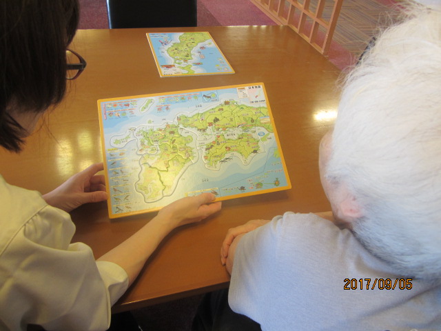 日本の地図を各地方ごとに型取ったパズルなのですが、そのパズルを片手に故郷の話題に花が咲き、なかな始まりません~(*´ω`)